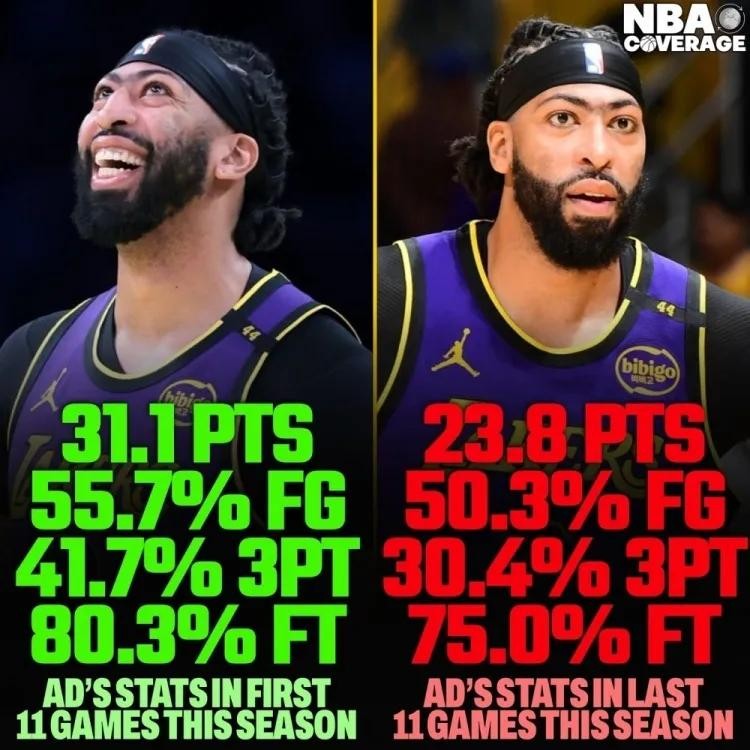 言归正传,现在联盟大概只有一个值得勇士交易也有机会得到的全明星内线,就正深陷低谷的浓眉哥,近7场比赛有5场得分低于20分,跟湖人当前混乱不堪的内部情况有着直接关系。