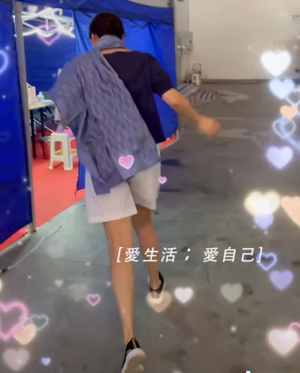 视频中,岳红身穿深色上衣白色短裤,她手里拿着新戏的剧本,一边走还一边对着镜头比耶,旁边配文“爱生活爱自己”。
