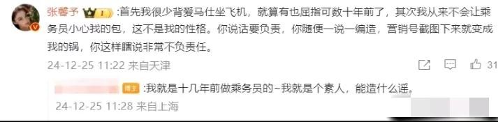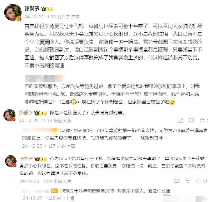 张馨予很快回怼道,表示自己很少被爱马仕包坐飞机,要是有,也是是十多年前了,并表示自己的性格大大咧咧,根本不会这么小心翼翼的做事,并要网友为她自己说的话负责。