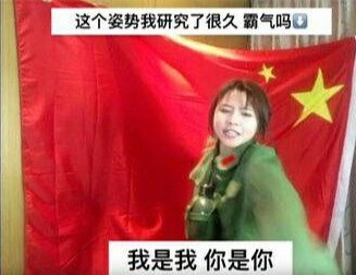 视频中的穆雅斓背景是一面国旗,穿着绿色衣服的她口中念着rap一样的,具有辱骂和自认为幽默的嘲讽字眼,夸张的表情和动作,让观众看了觉得“尬到脚趾发麻”。
