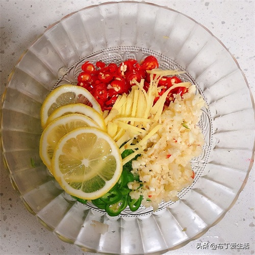③鸡爪处理完毕,再准备其他食材。柠檬对切两半,去籽,切片备用。生姜切细丝,大蒜拍散切末,线椒和小米辣切小段,不喜欢吃辣的可以少放或不放,香菜切小段。