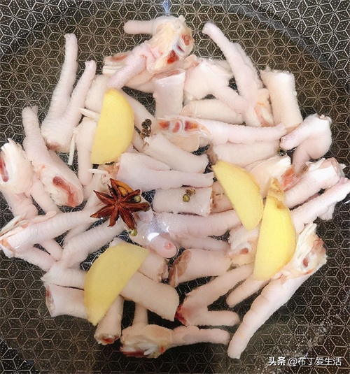 ②起锅,加足量清水,下几片老姜,八角,花椒和适量料酒,倒入鸡爪。大火烧开,焯煮20-30分钟(保证鸡爪煮熟),撇去浮沫。浮沫撇净后再搅动几下,让杂质和腥味能充分渗入水中。趁热捞出放热水中涮洗,去除油脂。再放凉水中浸泡凉透。