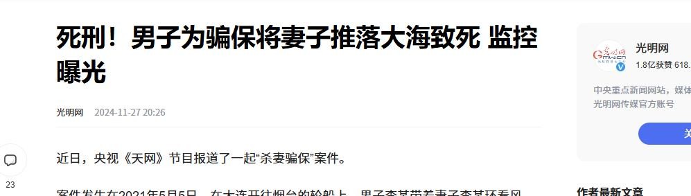 ( 信息来源:光明网 2024年11月27日 —— 死刑!男子为骗保将妻子推落大海致死 监控曝光 )