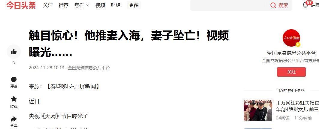 ( 信息来源:全国党媒信息公共平台 2024年11月28日 —— 触目惊心!他推妻入海,妻子坠亡!视频曝光…… )