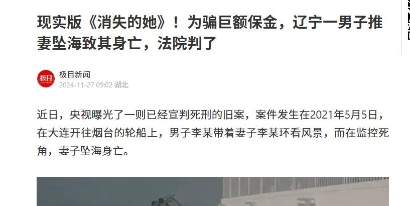 ( 信息来源:极目新闻 2024年11月27日 —— 现实版《消失的她》!为骗巨额保金,辽宁一男子推妻坠海致其身亡,法院判了 )
