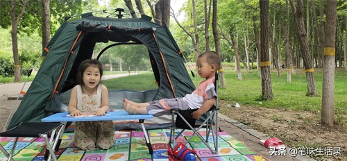 市内露营的地方好找,但能烧烤的地方就不那么多了。三十几度的白天,露营一定要选择树大稠密的地方。当然怎么能少得了孩子们玩水呢,所以这个时候的夏天露营我选择了组合出行套装