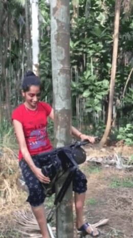 印度农民自己研发的爬树工具,小女孩玩得很开心。