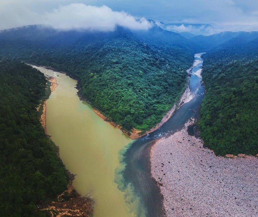 梅加拉亚邦的两条河流汇合时,要并行很长一段距离才会融合。