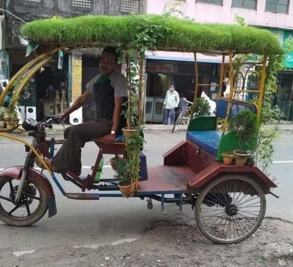 绿色三轮车,车夫在上面种植植物,是为了降低车内的温度...