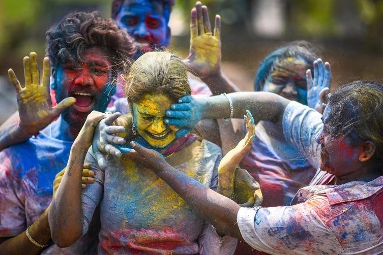 洒红节庆祝活动,居民的脸上涂满了彩色粉末,在洒水的时候会一起跳舞。