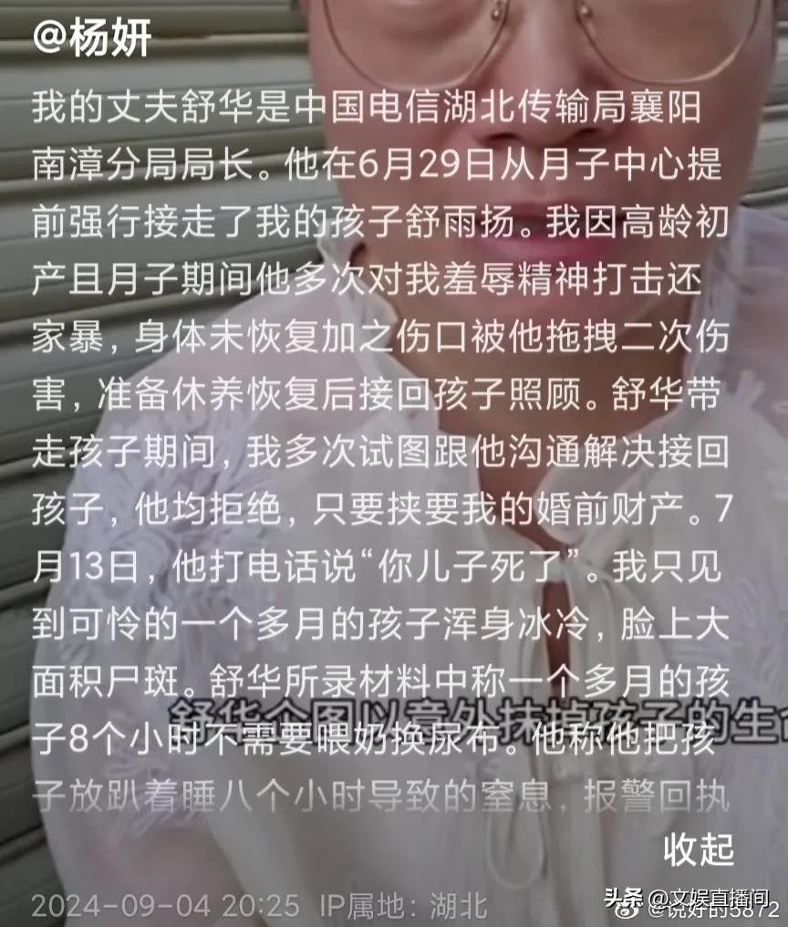 杨女士说:我的丈夫舒华是中国电信湖北传输局襄阳南漳分局局长。他在6月29日从月子中心提前强行抢走了我的孩子舒雨扬。我因高龄初产且月子期间他多次对我羞辱精神打击还家暴,身体未恢复加之伤口被他拖拽二次伤害,准备休养恢复后接回孩子照顾。淑华带走孩子期间,我多次试图跟他沟通解决接回孩子,他均拒绝,只要挟要我的婚前财产。7月13日,他打电话说“你儿子死了”。我只见到可怜的一个多月的孩子浑身冰冷,脸上大面积尸斑。淑华所录材料中称一个多月的孩8个小时不需要喂奶换尿布,他称他把孩子放趴着睡八个小时导致的窒息,报警回执中他称孩子头上压了个枕头。试问一个多月的孩子如何有能力自己趴着睡,还自己拿枕头捂住头脸?