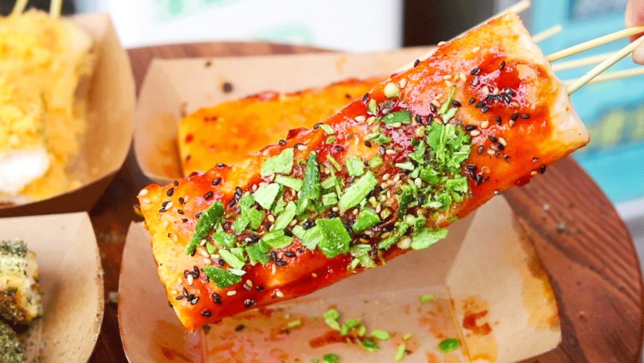 刷上酱料再裹上各类小菜串成串,