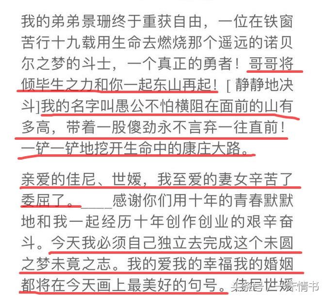 马景涛在文中先透露服刑19年的弟弟马景珊将重获自由,表示要倾毕生之力和弟弟一起东山再起,接着话锋一转,却自曝将与老婆离婚:“我的爱、我的幸福、我的婚姻,都将在今天画上最美好的句号”。
