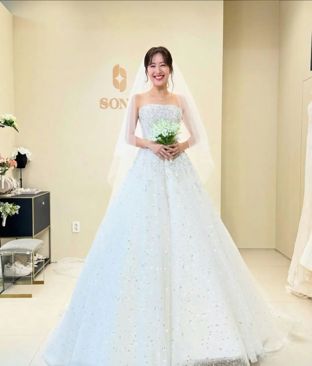 照片中的她,韩式卷发配上洁白婚纱,对着镜头甜甜一笑,那气质,啧啧,简直就是从韩剧里走出来的女主角啊!