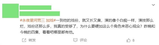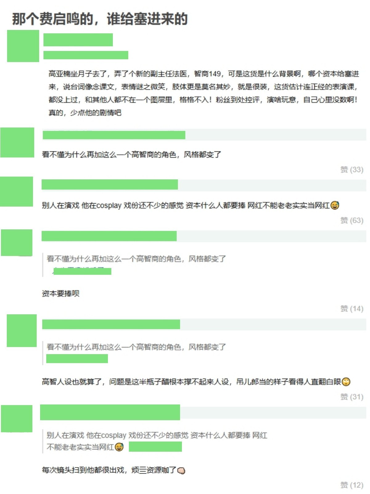 本身观众就对女法医变男法医的事情就耿耿于怀,如果对方演技好点,大家也就不多说了,但是费启鸣的演技太烂了。