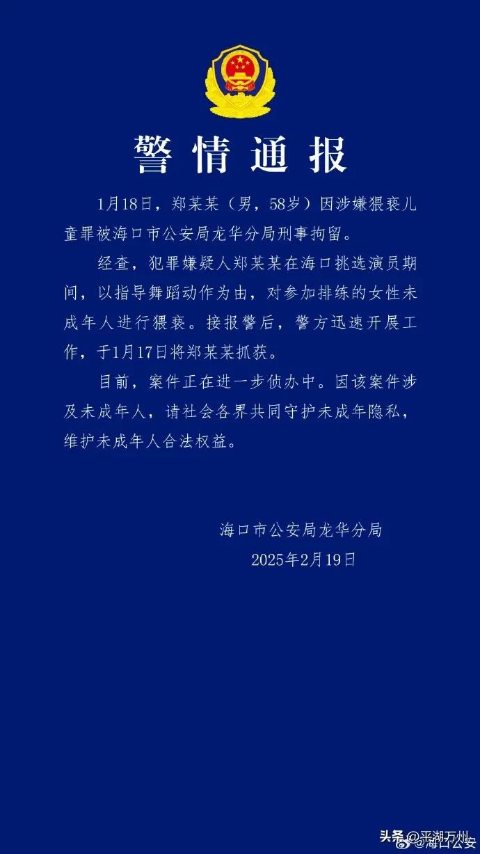1月18日,郑某某(男,58岁)因涉嫌猥亵儿童罪被海口市公安局龙华分局刑事拘留。