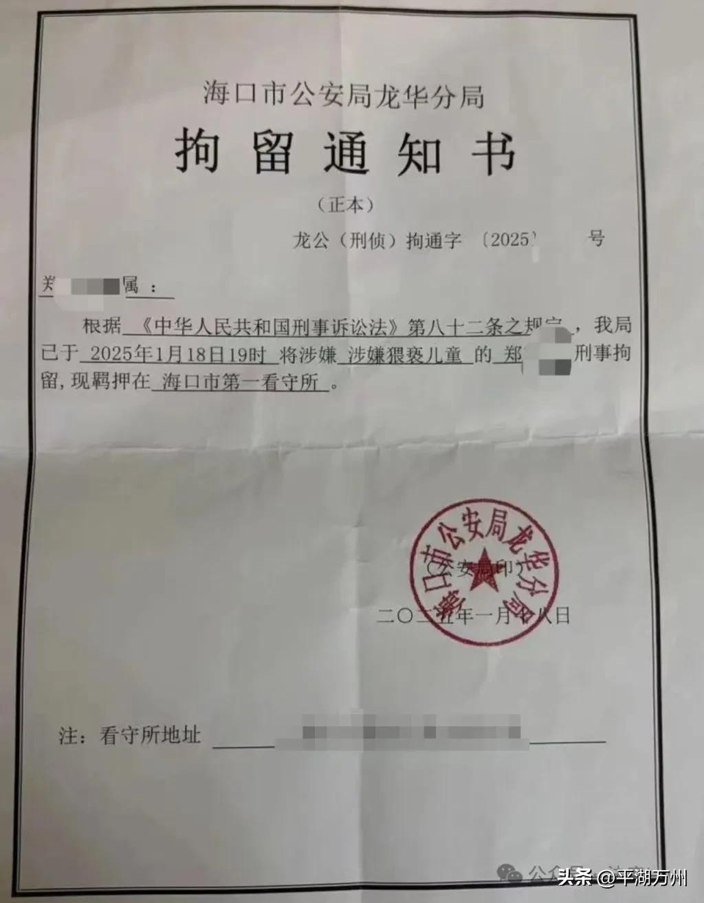 据澎湃新闻报道,据记者此前获得的《拘留通知书》显示,该通知书由海口市公安局龙华分局于今年1月18日签发,郑某峰因涉嫌猥亵儿童于当日19时被刑事拘留,其被羁押在海口市第一看守所。