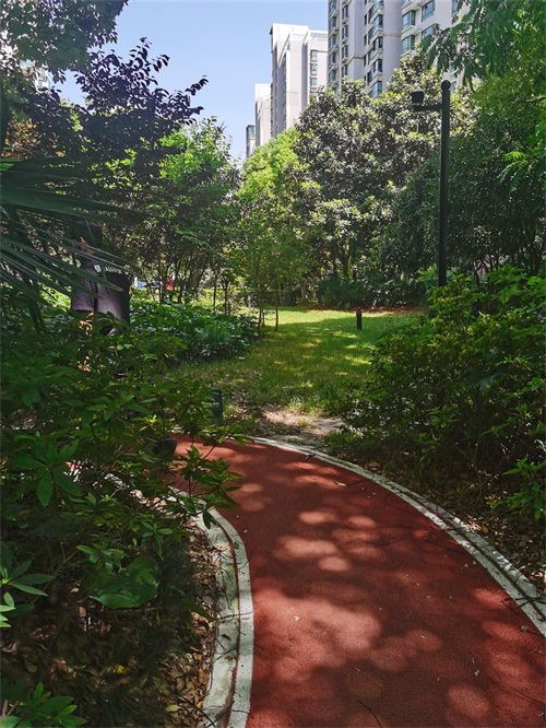 小区停车位旁的草坪边铺上一部分石子,为了方便业主雨天下车