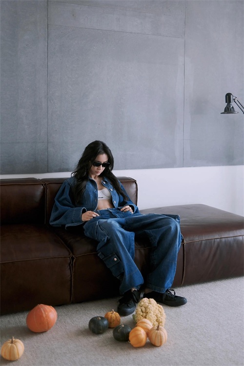 牛仔套装,里面搭配白色运动小背心,配上酷酷地黑色墨镜,个性十足。