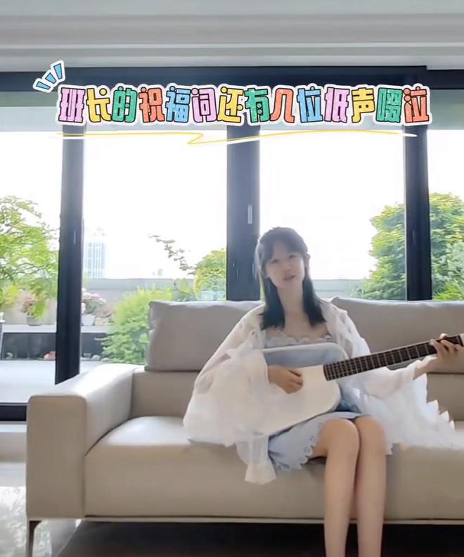 陆雨萱穿搭优雅,白色外套内搭蓝色短裙,她手拿吉他坐在沙发上,举止文静清新脱俗。