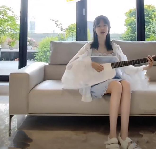 陆雨萱坐在沙发上弹着吉他唱着歌,但网友的视线却被她的大长腿给抢走。
