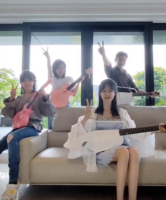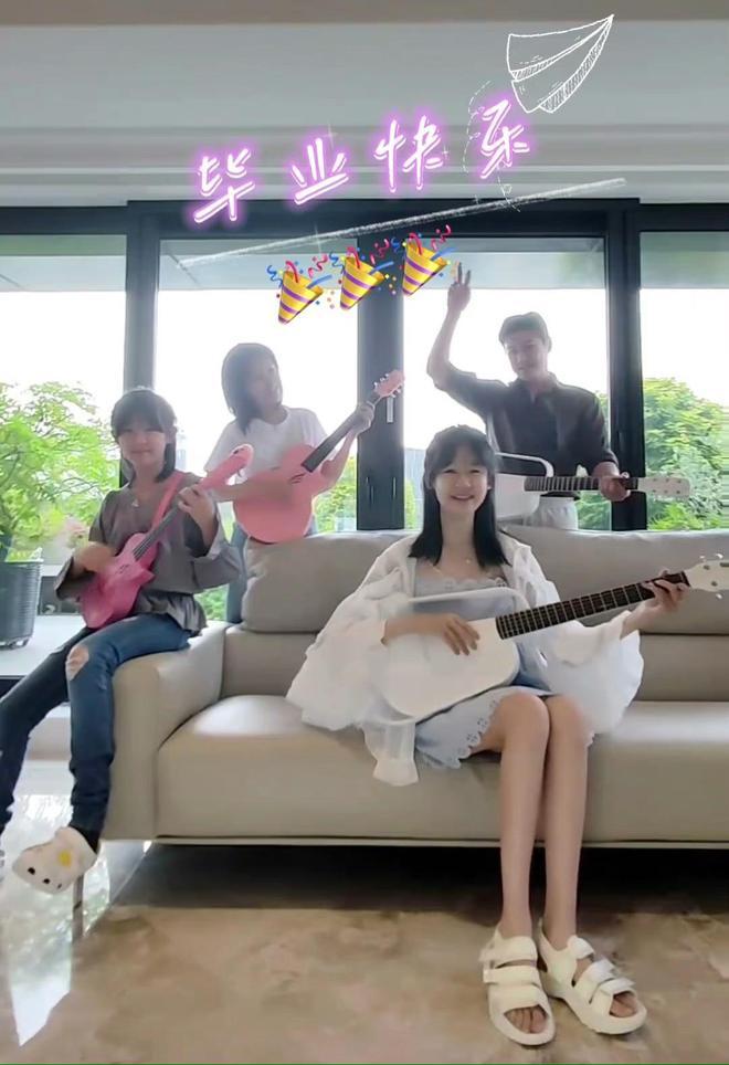 从陆毅回传的画面可见,当天他们一家四口齐聚一堂,在自家的客厅内放声高歌,四人人手一把吉他,欢声笑语氛围极佳。
