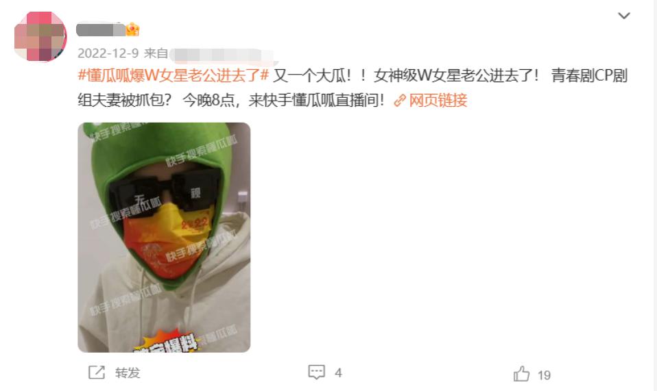 其实早前,著名娱记懂瓜呱就在社交平台上曾爆料 W 女星老公进去了,并宣称 W 女星是女神级别。