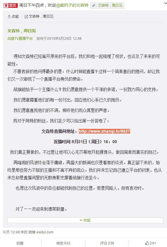 持续一周的文森特解约风波今天终于画上了一个小小的句号,战旗官方微博正式发文,表示文森特已经签约战旗TV,并将于周日下午4点正式开始直播,这也从侧面反应出,文森特此次誓与斗鱼对薄公堂了!