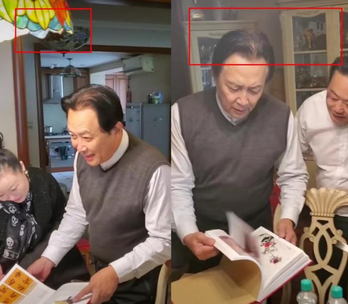 视频中唐国强正被三两好友围着,他翻阅自己不同时期的影视作品和书法集。身后的房子里吊顶大气,吊灯颜色绚丽十分奢华,纯白的置物柜更是显得豪宅简约又大气。