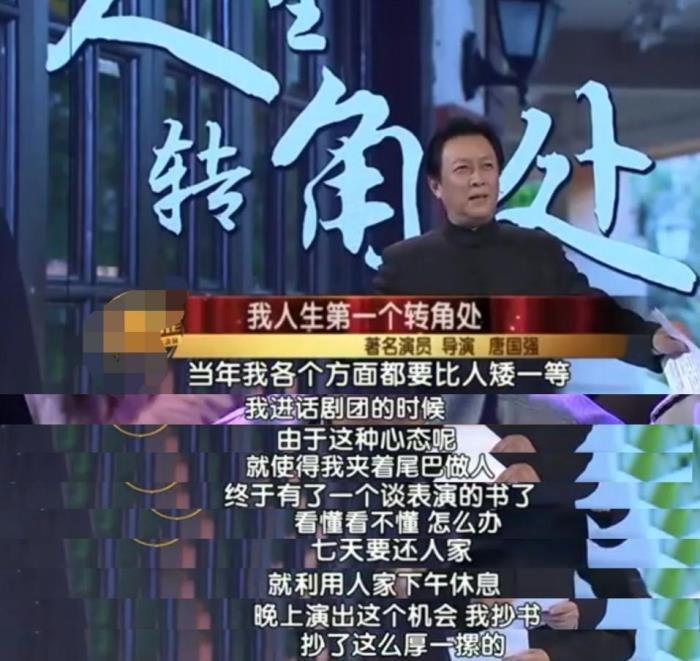唐国强对于角色的扮演和把控让如此多观众印象深刻,少不了他初学表演时花费的苦功夫。某次节目中,唐国强说起初进入话剧团时候自己没有表演经验非常胆怯,后来他终于有机会借到表演的书,不过7天就要还,于是唐国强就只能利用别人的空闲时间,深夜抄书学表演。