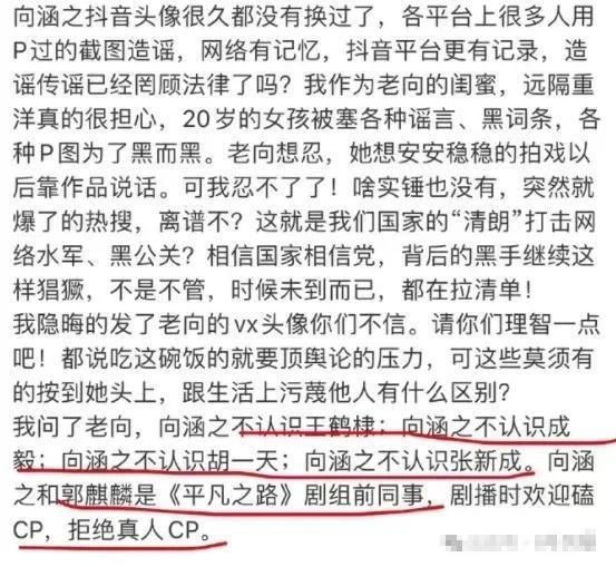 刚开始两人的工作室都没有回应,倒是向涵之的闺蜜发了 " 小作文 ",文章最后提及网传的微信头像不是向涵之的,也辟谣了传绯闻的成毅、胡一天、王鹤棣、张新成等一众男明星,称向涵之根本不认识他们。