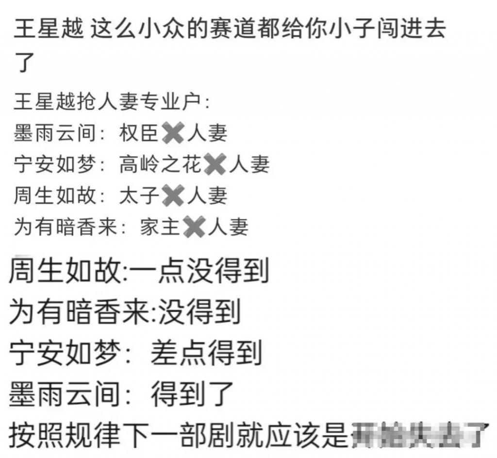 几个爱而不得的角色演下来,网友调侃王星越是内娱 " 抢人妻专业户 ",前几部都不是官配,这次才终于抢到手了。