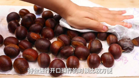 2、洗干净的板栗,要准备一些厨房纸巾,将板栗上面的水分给擦干净,方便后面的开口操作。