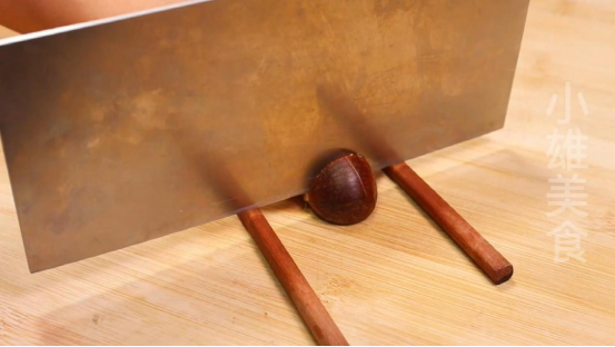 3、接着我们就可以拿出一双筷子,把它分开,再拿一颗板栗,放到筷子的中间,然后就可以用菜刀,在板栗凸起的那一面浅浅的切个十字花刀。