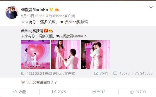 5月13日,何猷君在上海某购物中心向奚梦瑶求婚。何猷君单膝跪地牵起奚梦瑶的手,动情地说:“marry me?”奚梦瑶点头后何猷君兴奋大喊:“She said yes!”谢娜,陈赫,陈学冬,郭敬明等圈中好友现身见证祝福。