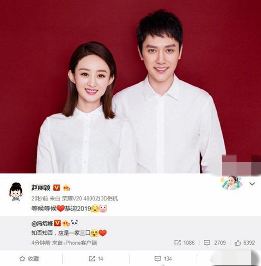 2019年1月1日,冯绍峰微博发文:“知否知否,应是一家三口。”随后,赵丽颖转发称:“等候等候,恭迎2019”,承认怀孕喜讯。