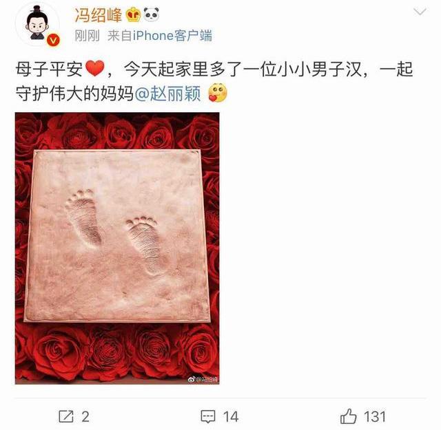 3月8日,冯绍峰在微博晒出宝宝的脚丫照宣布妻子赵丽颖产子喜讯:“母子平安,今天起家里多了一位小小男子汉,一起守护伟大的妈妈@赵丽颖 ”。