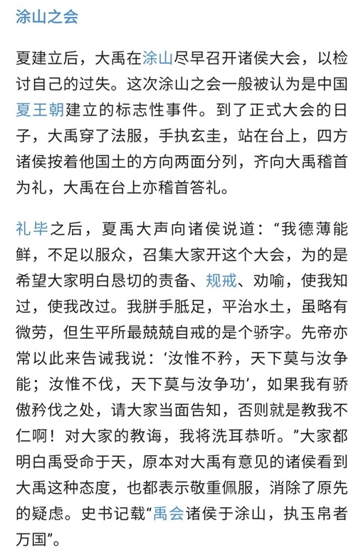 禹曾在涂山大会天下诸侯,献上玉帛前来朝见的诸侯竟达万名之众。《左传·哀公七年》记载:“禹合诸侯于涂山,执玉帛者万国。”