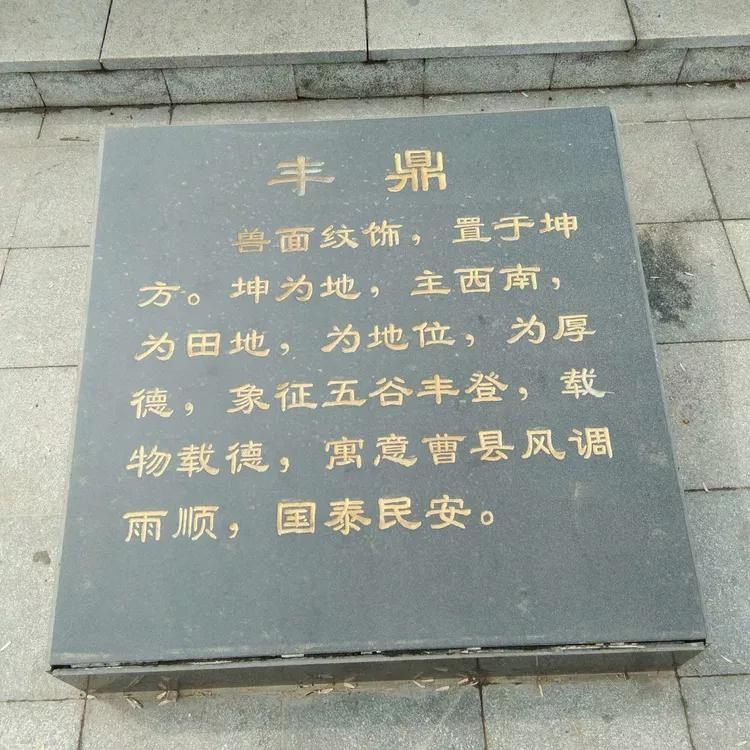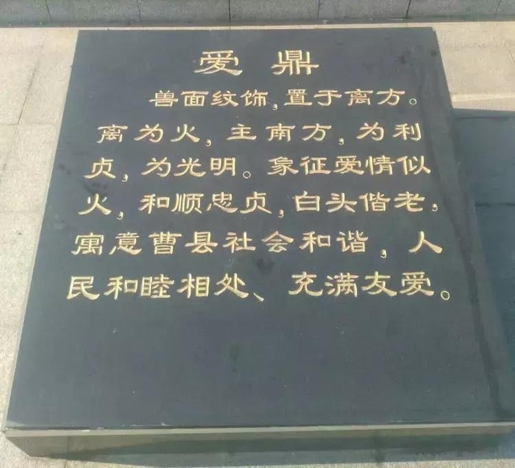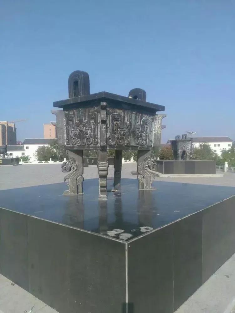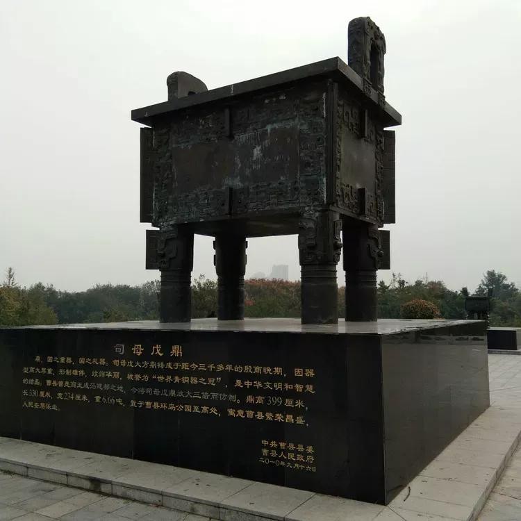 曹县商王城汤建阳之地。今將司母戊鼎放大三倍,高399厘米,长330厘米,宽234厘米,重6.66吨,置于曹县四季河公园最高点,意为曹县繁荣昌盛,人们安居乐业。