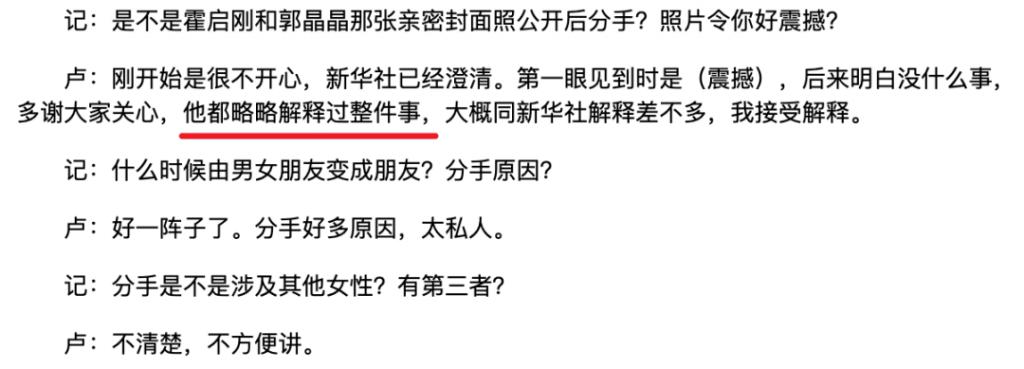 卢恬儿说,一开始看到照片很不开心,后来媒体澄清了(是的新华社都出来澄清过郭晶晶的绯闻),霍启刚也向自己解释过。