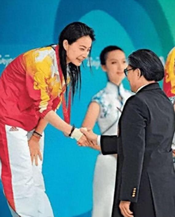 08年北京奥运会,霍震霆给郭晶晶颁奖,