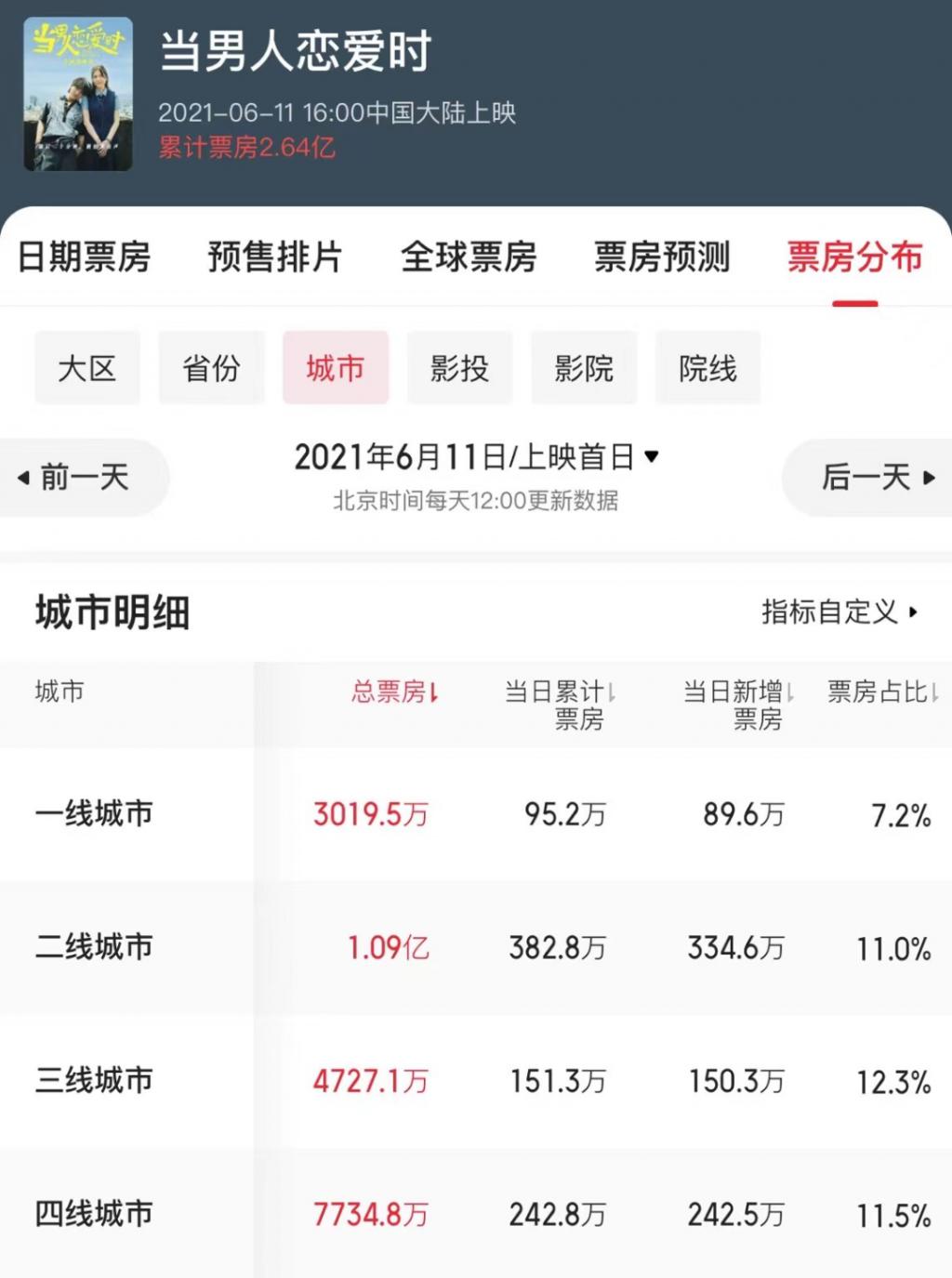 比如之前发行的《当男人恋爱时》," 这部电影的豆瓣口碑不佳,一线城市观众不吃这套。所以它的营销和发行策略都更为下沉。" 结果不出所料,二线城市票房上亿,四线城市票房居然都有七千多万,是一线城市的两倍多。" 一线城市没人看,四线城市情侣都在抢票 " 就是当时的状况。