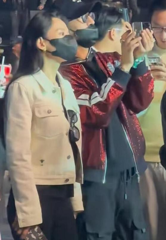 打扮休闲低调,气质出众,身材也很好,一头长发随意披散着,两人站在一起很般配。