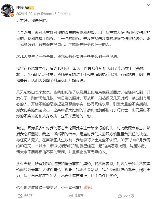 2024年5月20日汪峰对外官宣了和森林北的恋情,并放出了两人相识到相恋的时间线。