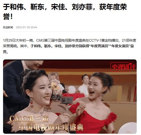 信息来源:极目新闻 2025-01-30 于和伟、靳东,宋佳、刘亦菲,获年度荣誉!