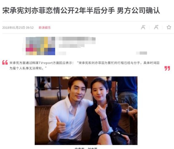 信息来源:新浪网 2018-01-25 宋承宪刘亦菲恋情公开2年半后分手 男方公司确认