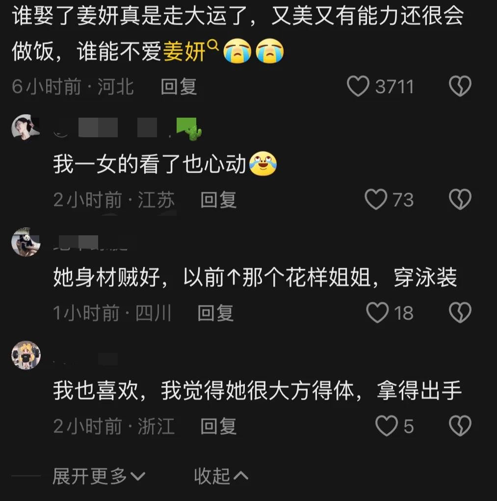 有网友表示:能娶到姜妍地男人真的是太有福了,人美又有才,还会做饭,简直不要台完美的女人了。