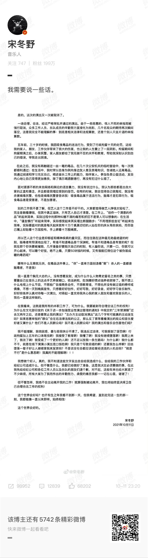 他还说,自己虽然吸毒犯错,但也只是一个「受害人」。这些年他安分守己,只想靠音乐养家糊口,但恶意举报者让他无法演出,剥夺了他合法劳动的公民权利。