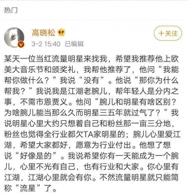 高晓松昨日发文暗讽流量明星,文风特别带感,虽纷纷说他暗有所指,但各路“流量”小主可能也会纷纷陷入自省。