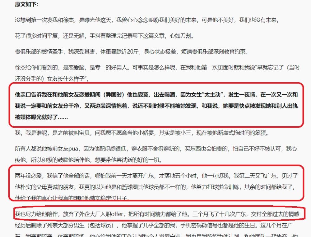 中国男篮现役国手、广东队后场冠军徐杰的前女友,通过个人网络平台发表2000余字长文,愤怒声讨徐杰,指责徐杰欺骗感情,并斥徐杰为无情之人,双脚上两条船,让她成了“小三”!最近因为情绪问题,我的体重下降了近20斤,身体和精神状态都极其糟糕!所以,她希望广东队的杜锋能够深刻地教训和约束徐杰!